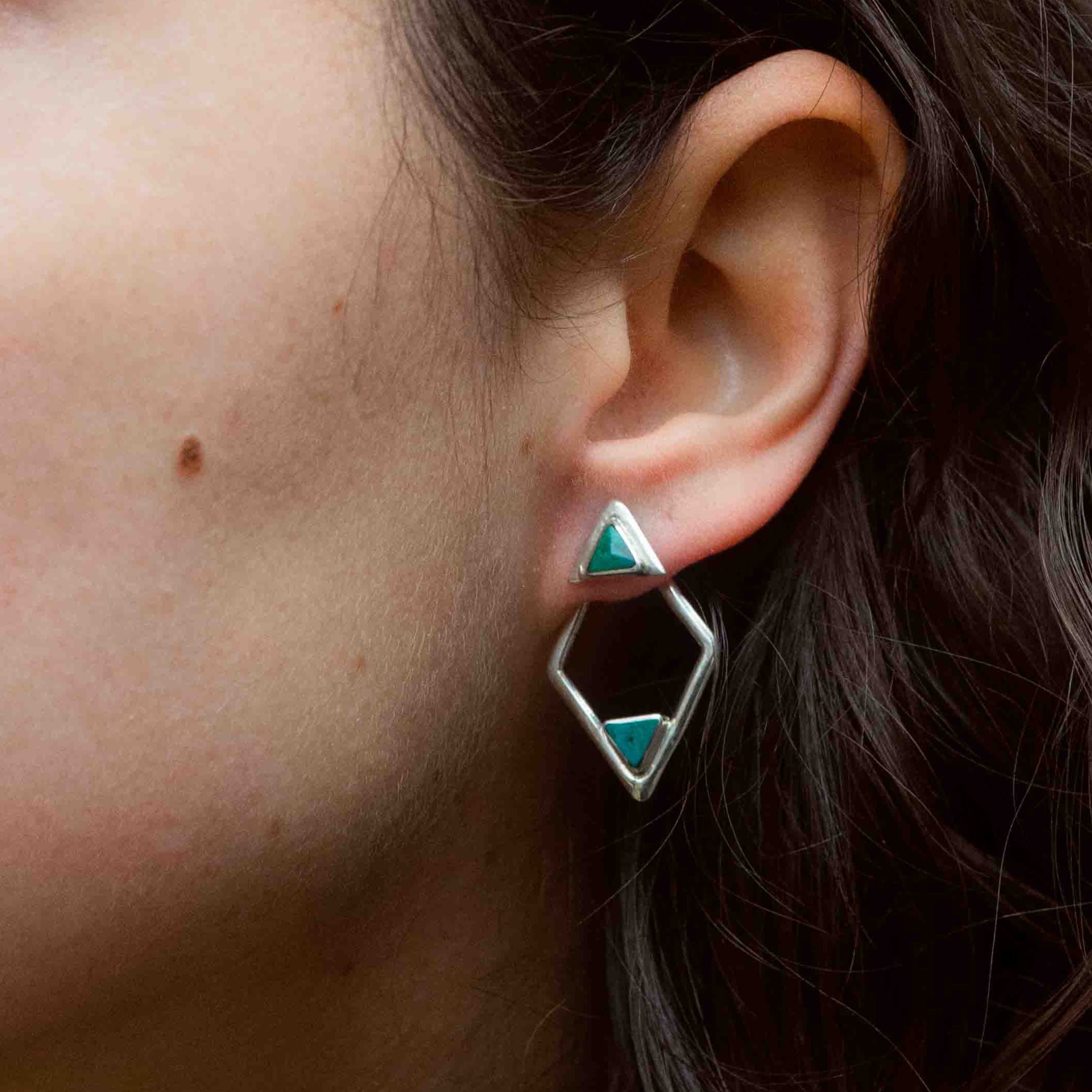 These elegant Rhombus silver 950 stud earrings with chrysocolla have been carefully handmade from Peruvian silver 950, each highlighting the serene elegance of Chrysocolla.