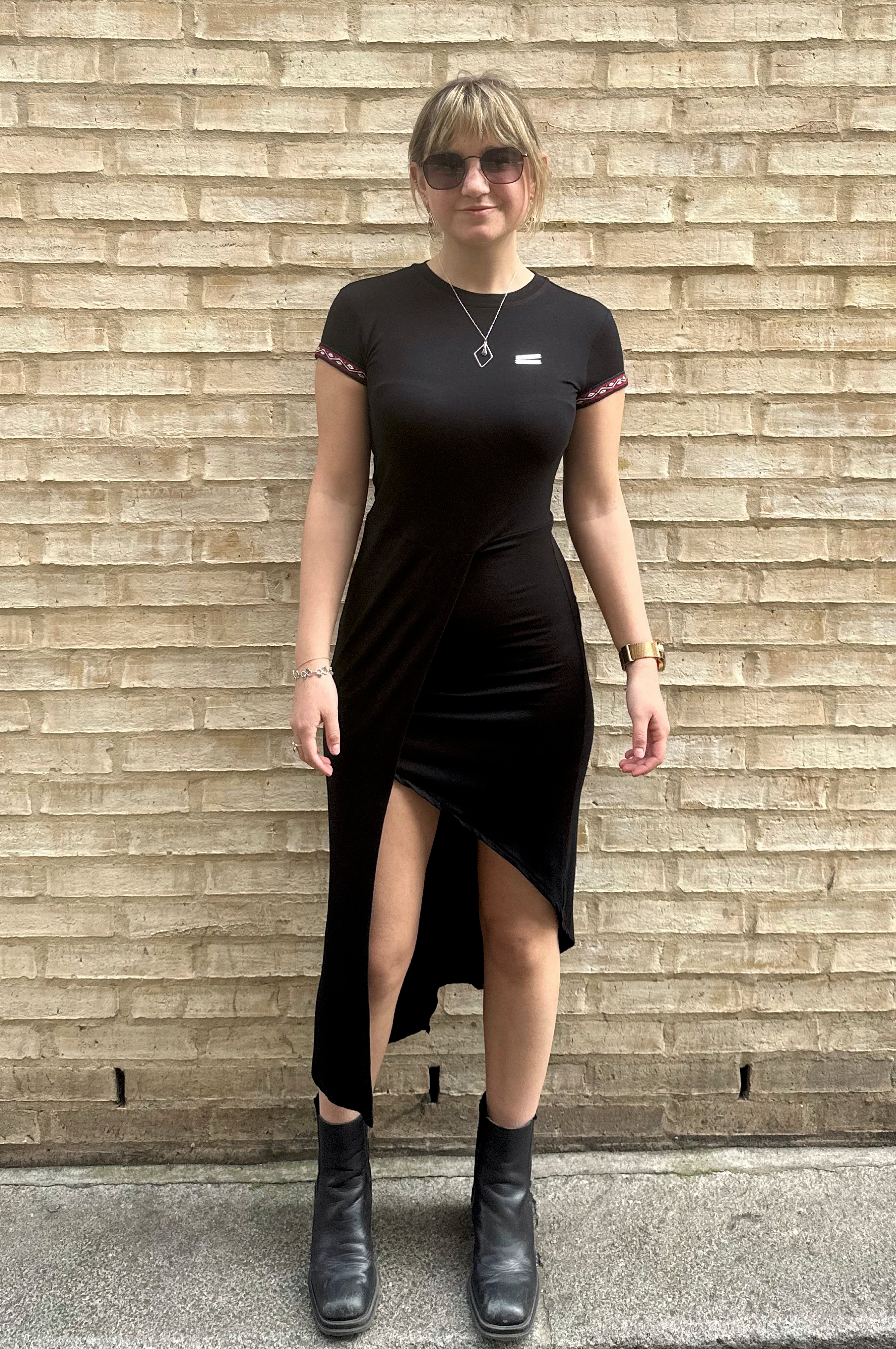 This upcycled asymmetrical midi black dress is part of our new initiative to prevent waste by giving existing products a new lease of life.