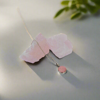 This round pendant has been handmade with pink opal and silver 950. We have matching stud earrings available. Dimensions: 1cm Chain length: 46cm...