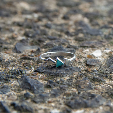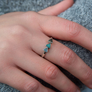 This elegant ring features three small triangles, with the central one adorned with a captivating Amazonite gemstone, delicately set within a meti...