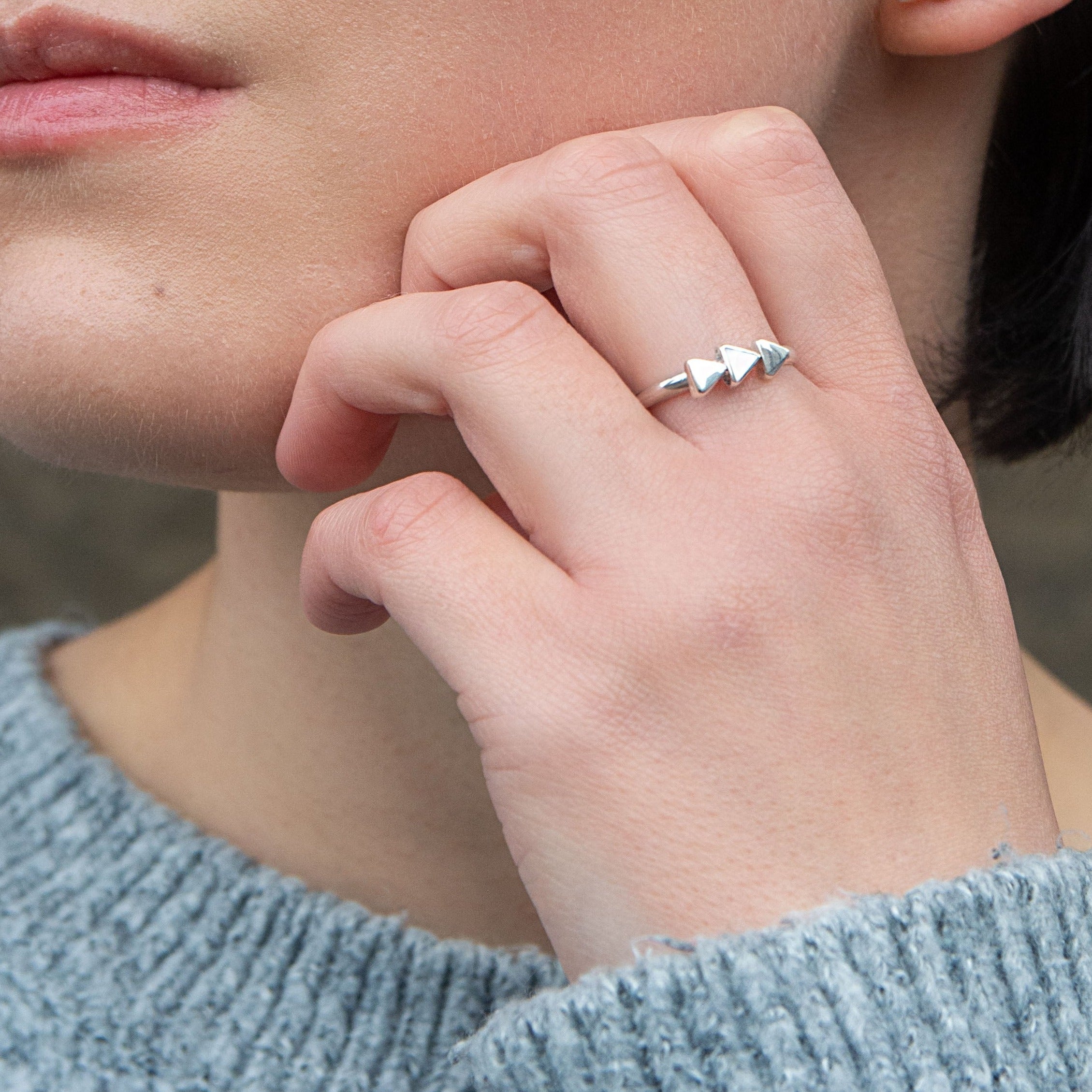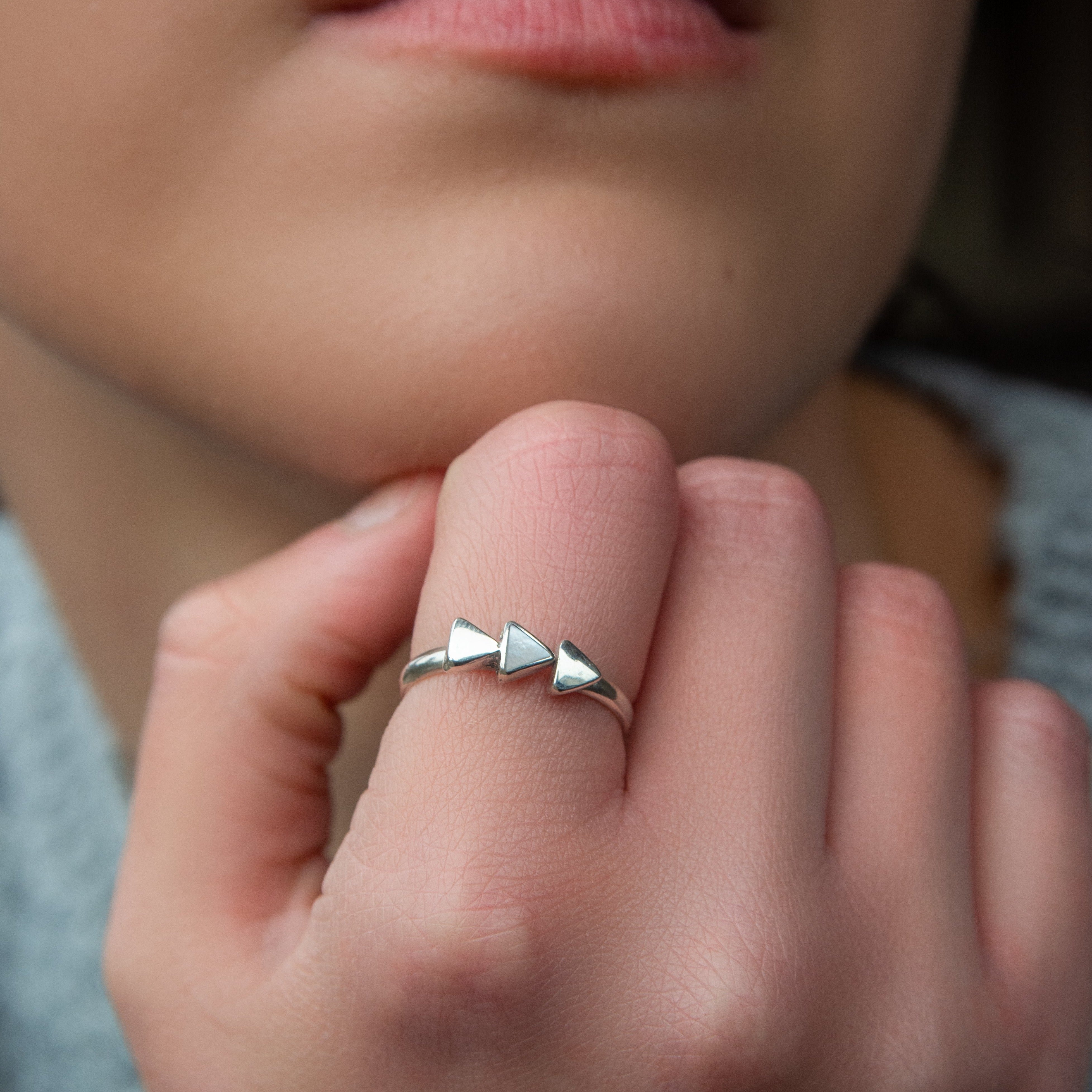 This exquisite ring features three small triangles, with the central one adorned with a delicate Mother of Pearl shell, delicately set within a meticulously crafted Peruvian silver 950 band. The adjustable design ensures a perfect fit, allowing you to wear this ring comfortably on any finger.