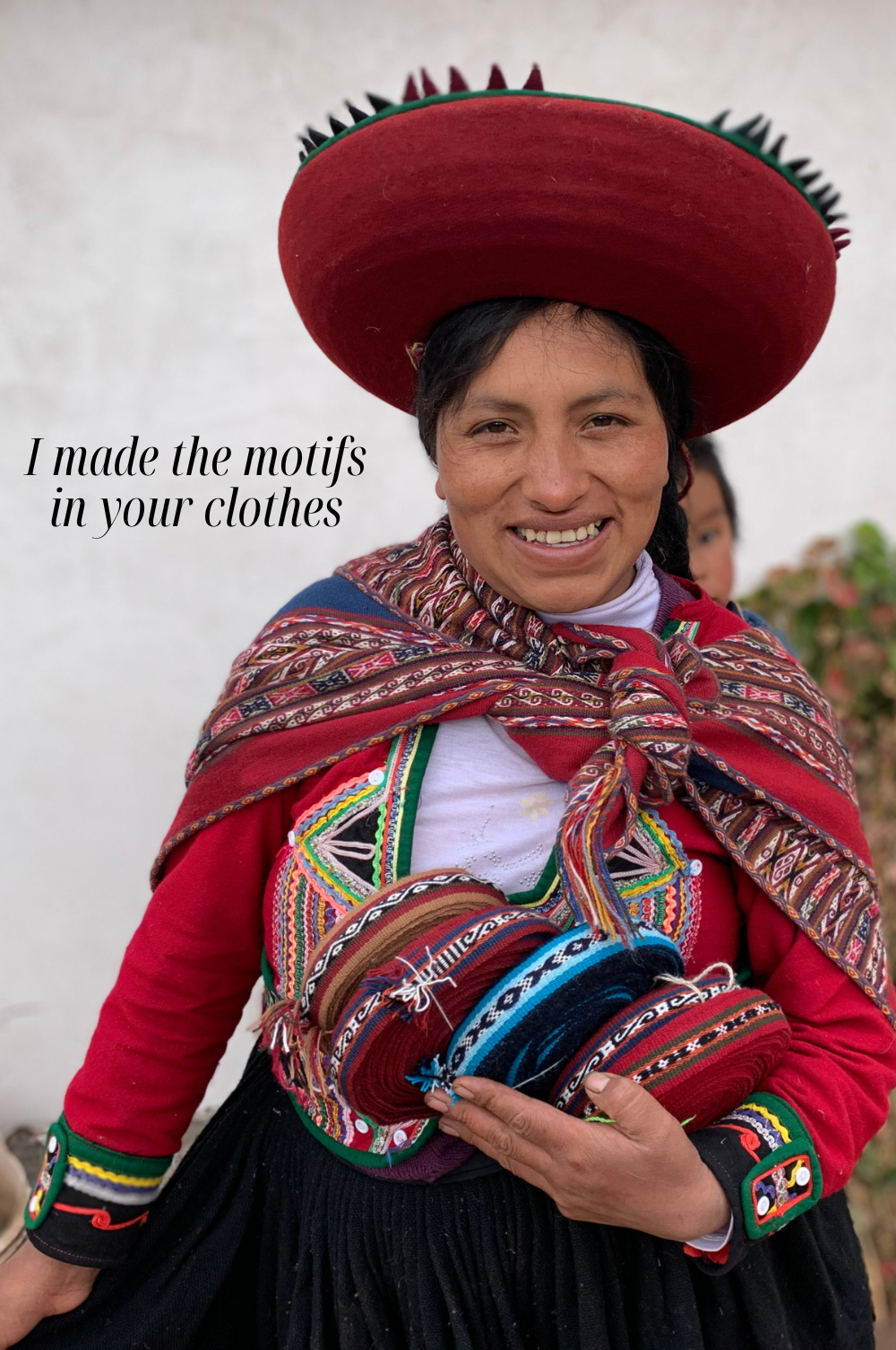 Significado de los motivos: el motivo que parece una S representa la herramienta que utilizan en la comunidad para trabajar el campo, que tiene la misma forma. Se llama cuty en quechua, y el motivo lleva su nombre. Algunas mujeres tejen una línea o puntos entre los cutys, otras no. Así que, aunque tu amiga compre la misma pieza, los motivos pueden variar un poco, lo que hace que cada pieza sea única (por lo que la tuya puede no ser exactamente igual a la de la foto).