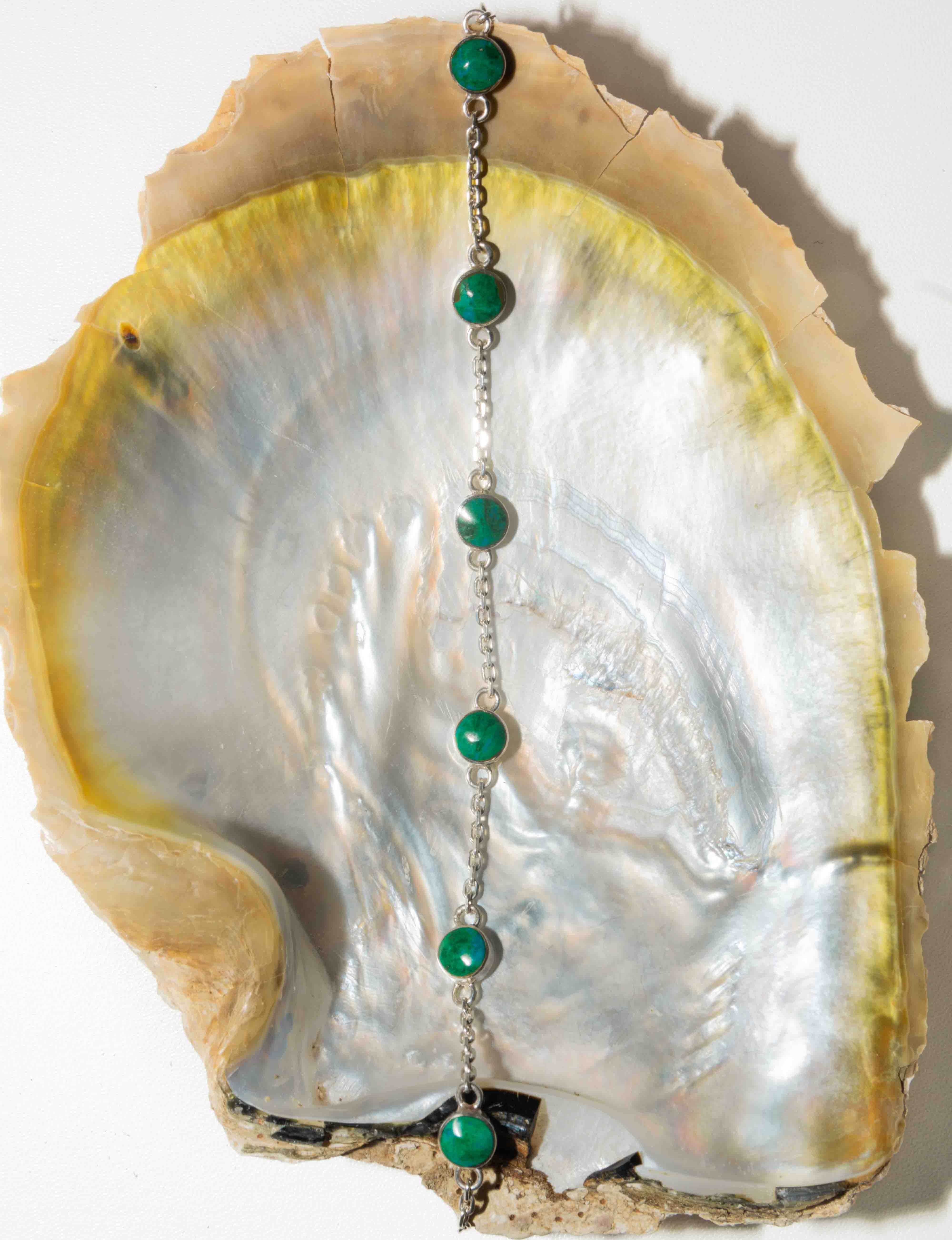 The vibrant green-blue hues of Chrysocolla complement the radiant silver, symbolising harmony in nature. Embrace the soothing properties and emotional balance of this enchanting gemstone, represented in each circular link.