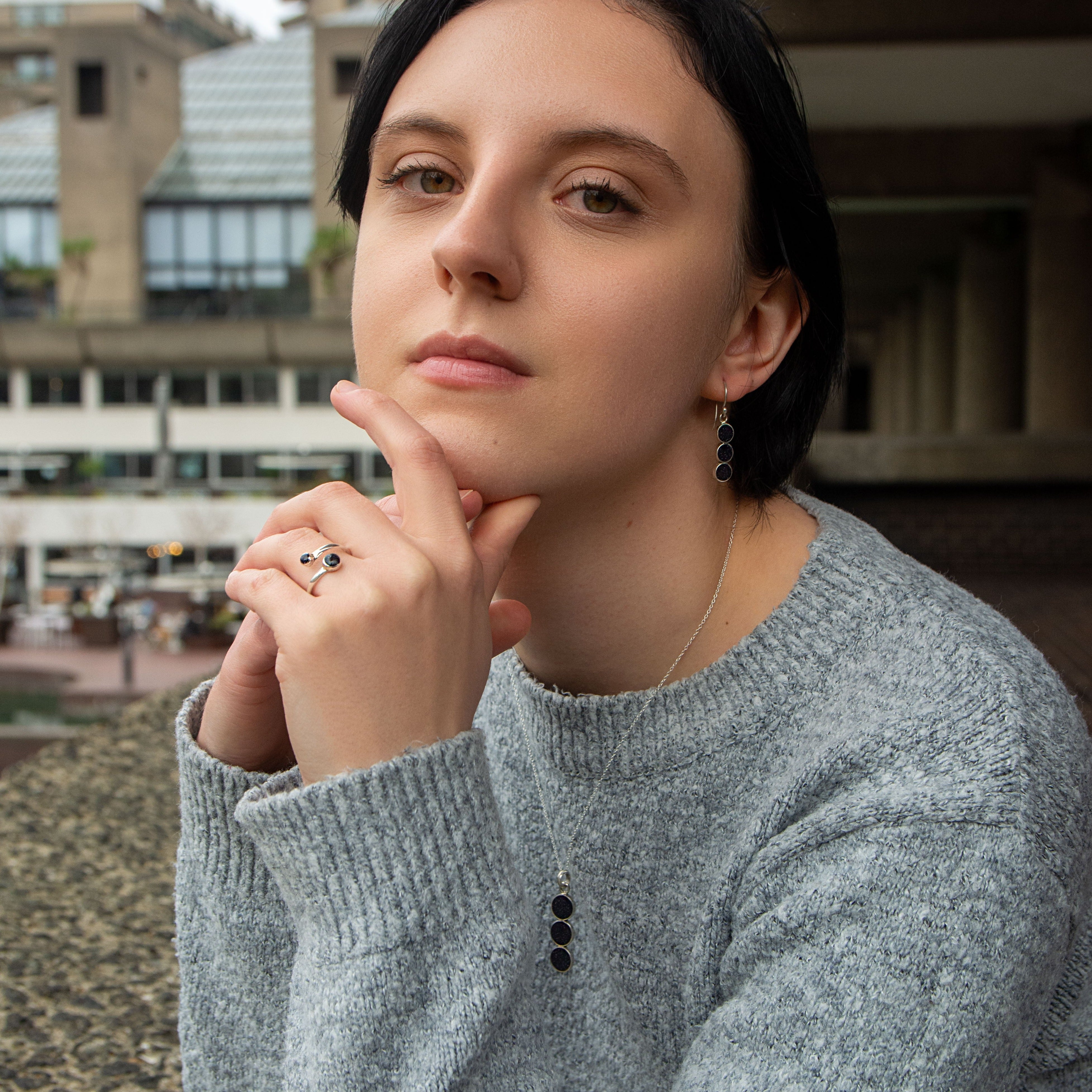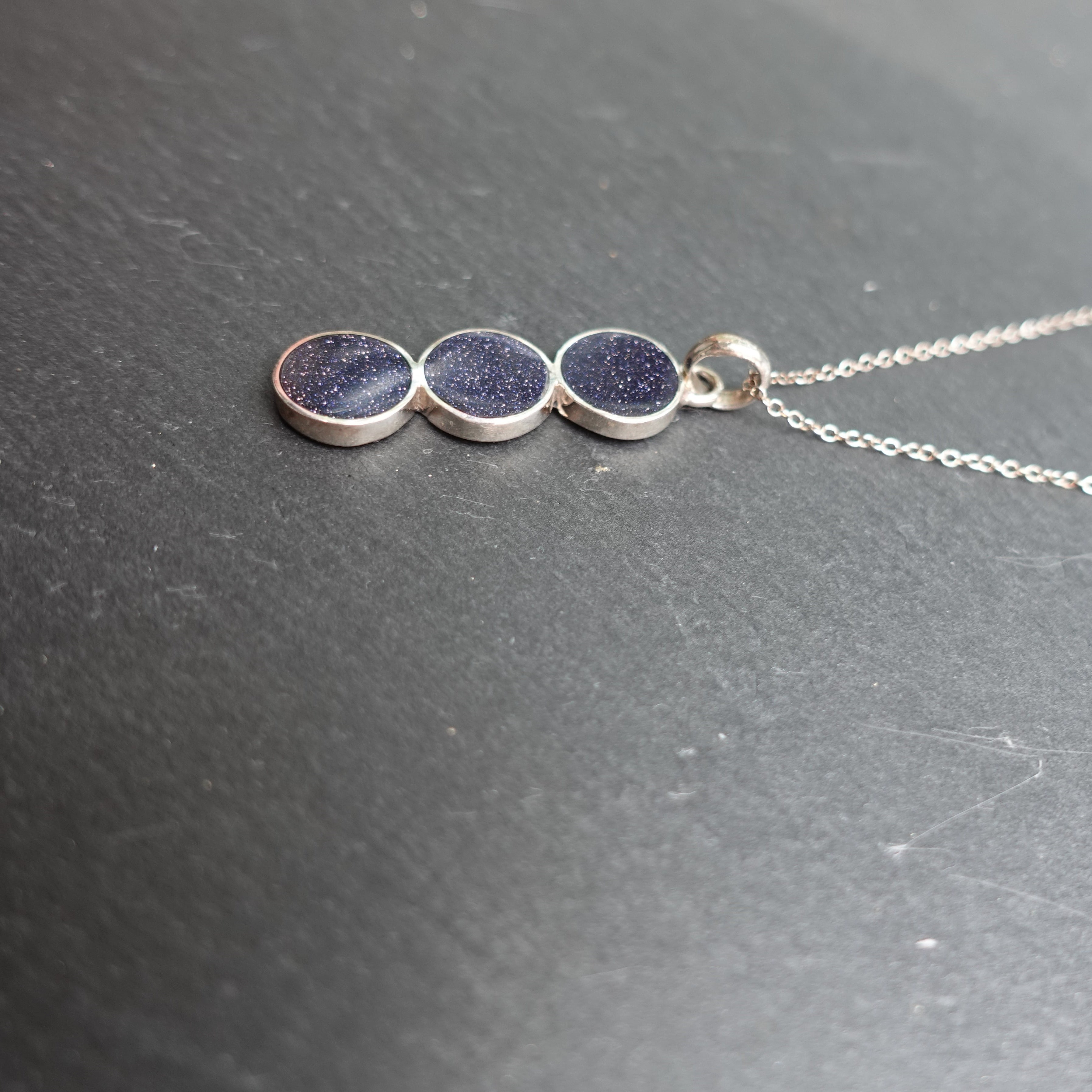 This celestial necklace features three concentric circles meticulously crafted from luminous Peruvian silver 950, each encasing the enchanting blue sandstone. The deep azure hues of the sandstone against the radiant silver create a mesmerising composition, symbolising unity, balance, and the vastness of the universe.